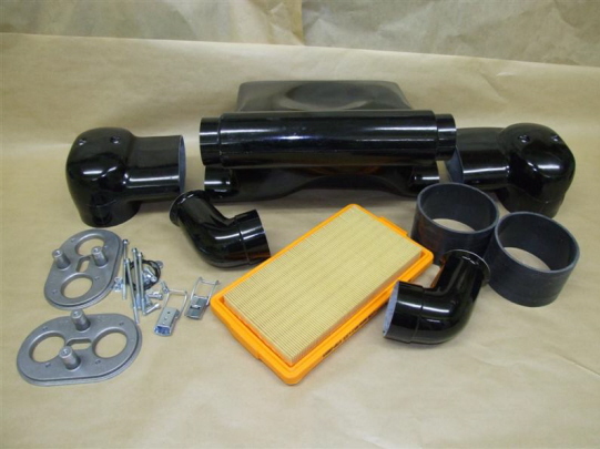 Zentralluftfilteranlage T1 Por. versetzt. Speziell für Saugrohre ,die keinen Versatzausgleich haben z.B. Die neuen Udo Becker Tuning oder die klassischen Riechert Saugrohre oder Adere. Die Zentralluftfilteranlage T1 Por l wird in Epoxi ,schwarz ,gefertigt Die Luftschläuche haben einen Durchmesser von 120mm Oval gedrückt, der Luftdurchsatz ist für leistungsstarke Typ4 Motoren bis 2,1l Hubraum gut geeignet . Es wird normalerweise für 44 er Weber Vergasergrundplatten geliefert .